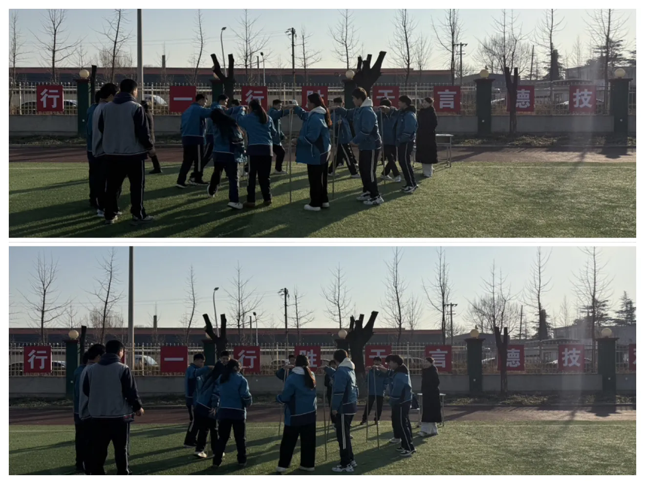 齐头并进和钢铁丛林项目同样需要团队配合。前者要求6人一组手持旗杆同步往返,后者则需10人轮流交换立杆,考验着同学们的协调能力与专注力。大家在活动中相互鼓励,共同完成挑战。