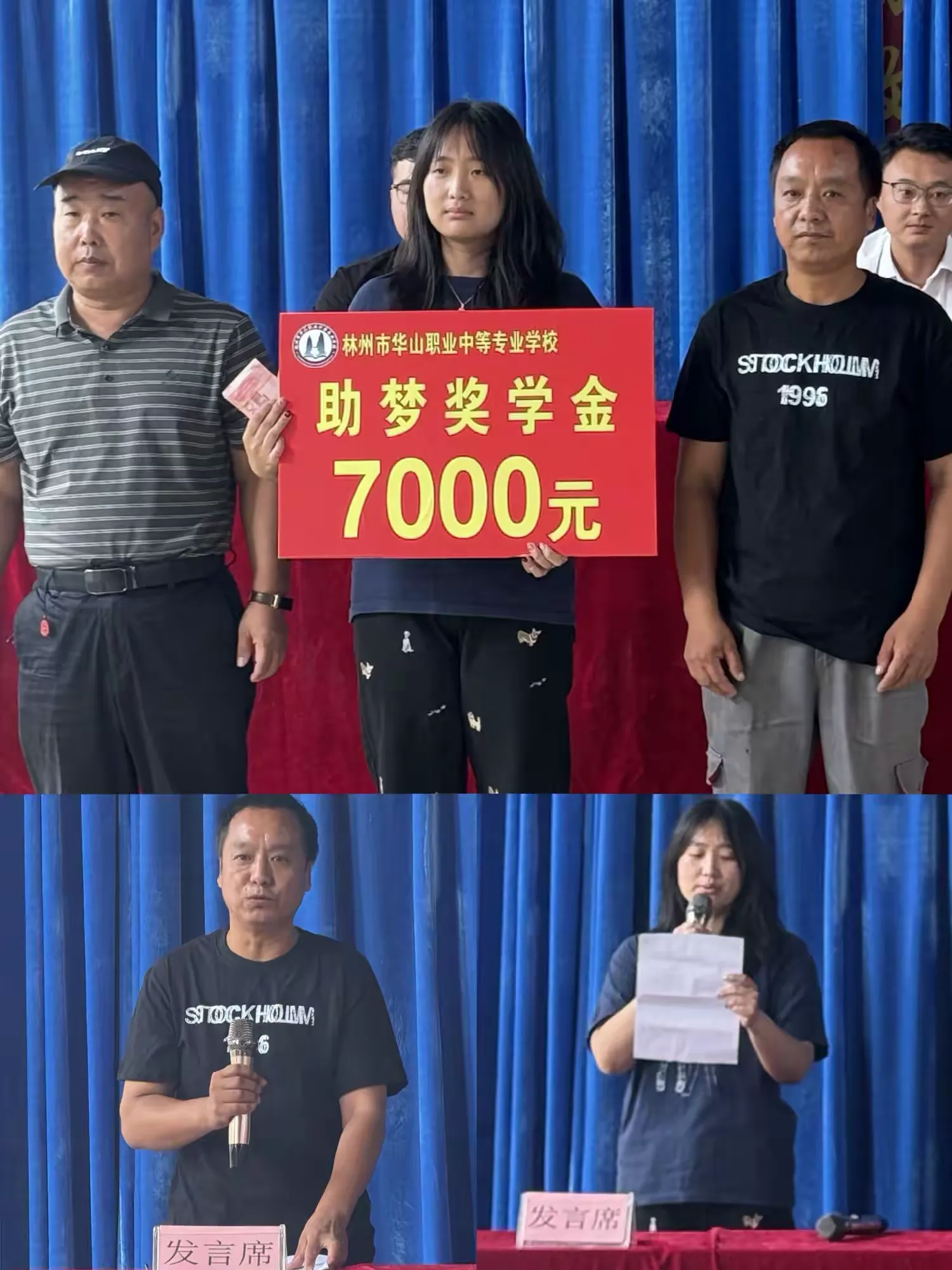 学校董事长向考入本科院校的元菲同学发放7000元助梦奖学金。获奖学生元菲和学生家长发表获奖感言。