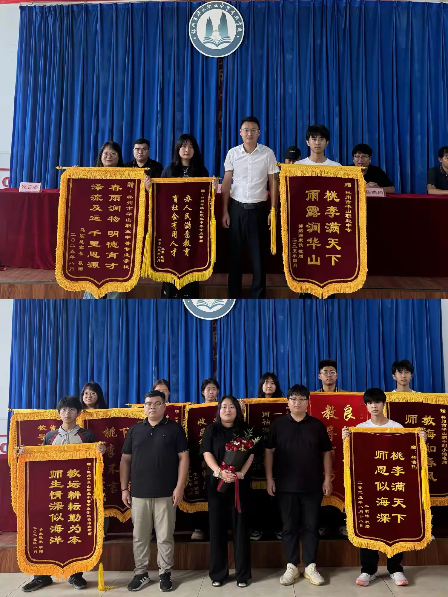 学生自发向辛勤的园丁、他们热爱的母校敬献锦旗,祝福学校蒸蒸日上,越来越好。