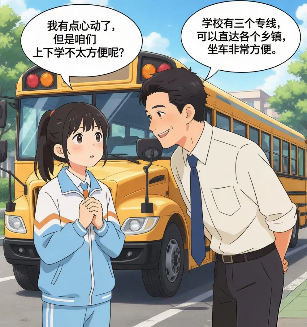 学校联合公交公司,开辟了市区、南部、北部三个专线,可以直达各个乡镇,坐车非常方便。