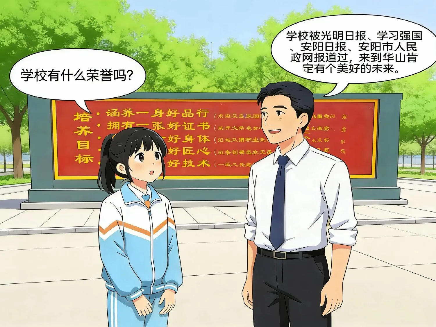 学校培养目标是“五个一”:涵养一身好品行、拥有一张好证书、练就一个好身体、秉持一颗好匠心、打磨一手好技术,让每一个同学在新的赛道上掌握一技之长。学校被光明日报、学习强国、安阳日报、安阳市人民政府网报道,来到华山学校,肯定有一个美好的未来。